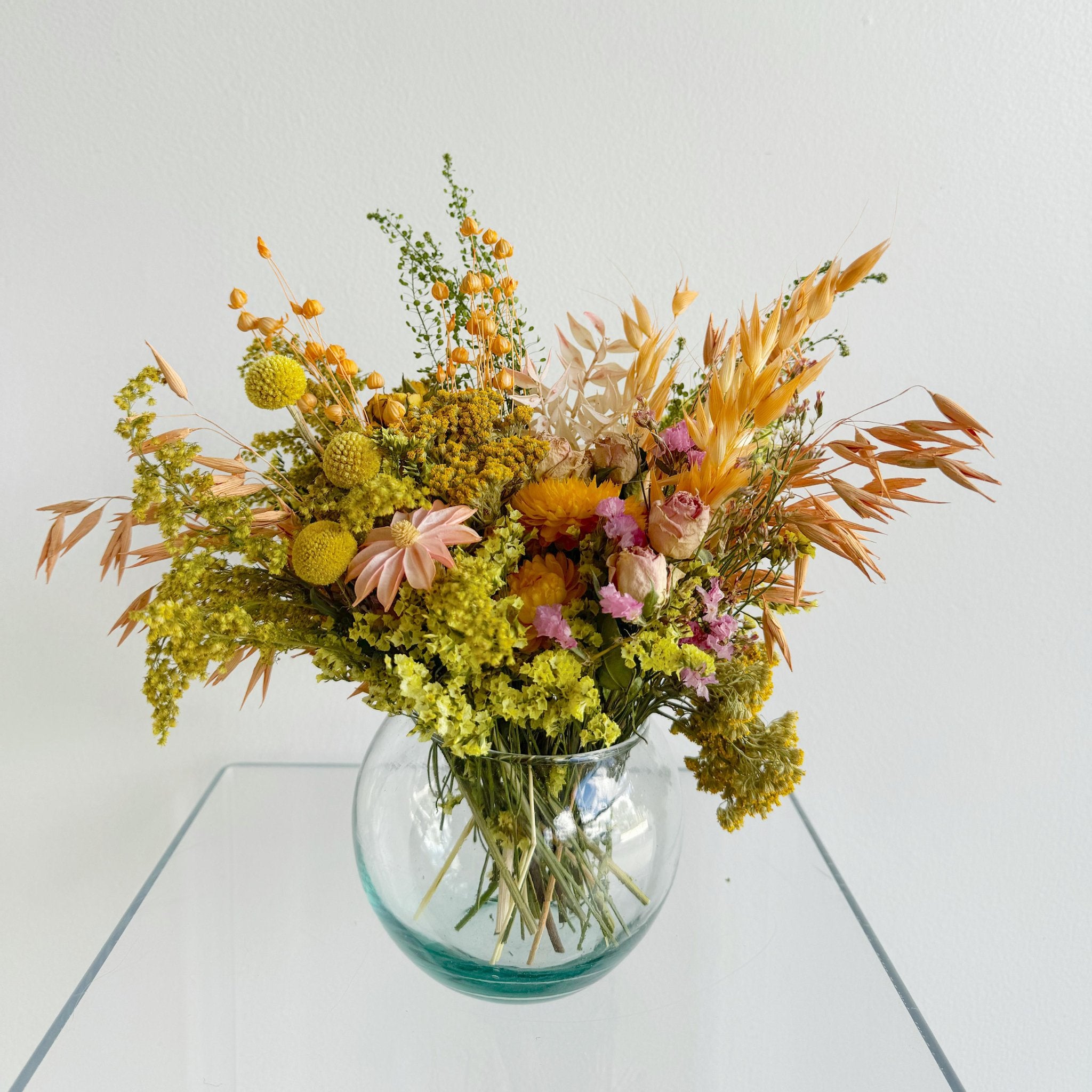 small yet bold, our entry level dried flower arrangement is the ideal pop of floral for any space. styled in our small glass vase, this size makes the perfect gift or floral accent for smaller tables like night tables, side tables, or even coffee tables. the small dried arrangement comes in four color stories - moody, purple and blue hues, romantic, rosy pink hues, bright, yellow, orange and coral hues, and nude & white, white & cream hues.