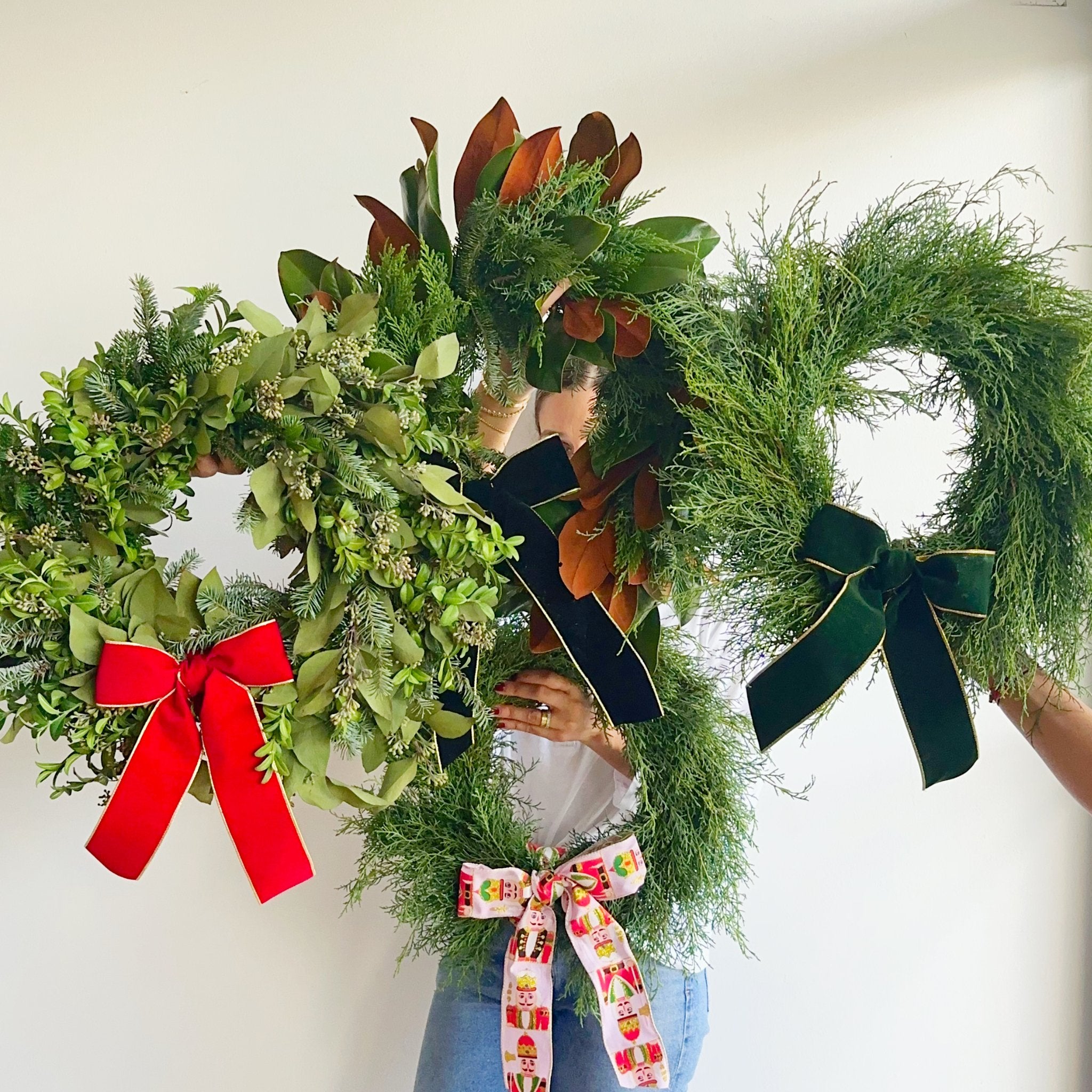 our winter wreath is here! these holiday door wreaths are fresh and handmade to order and come in two different sizes and options. choose from: