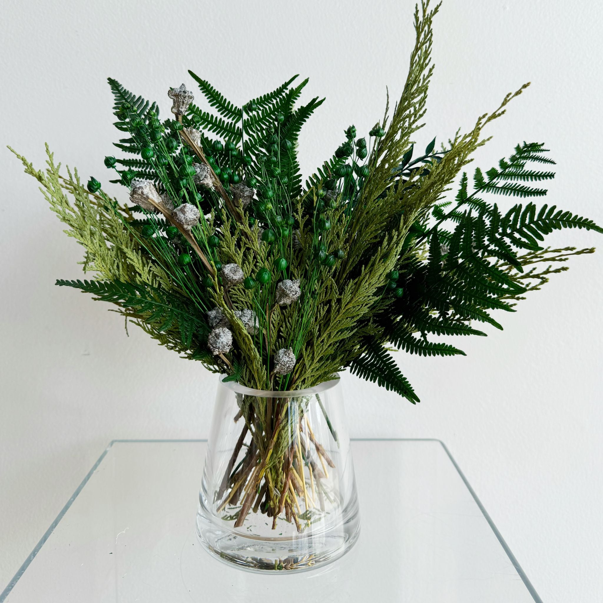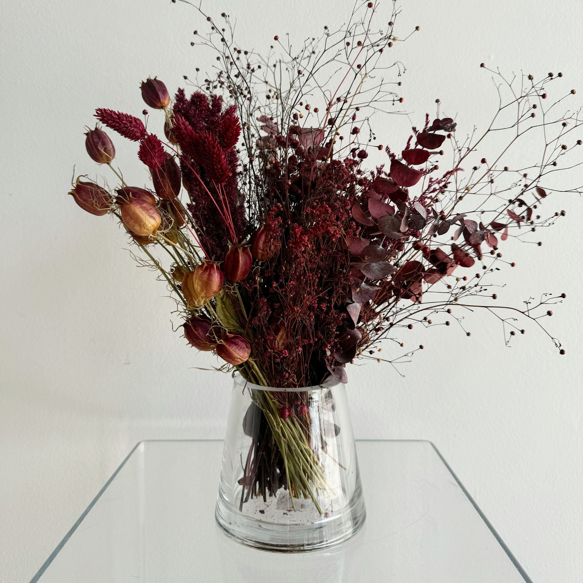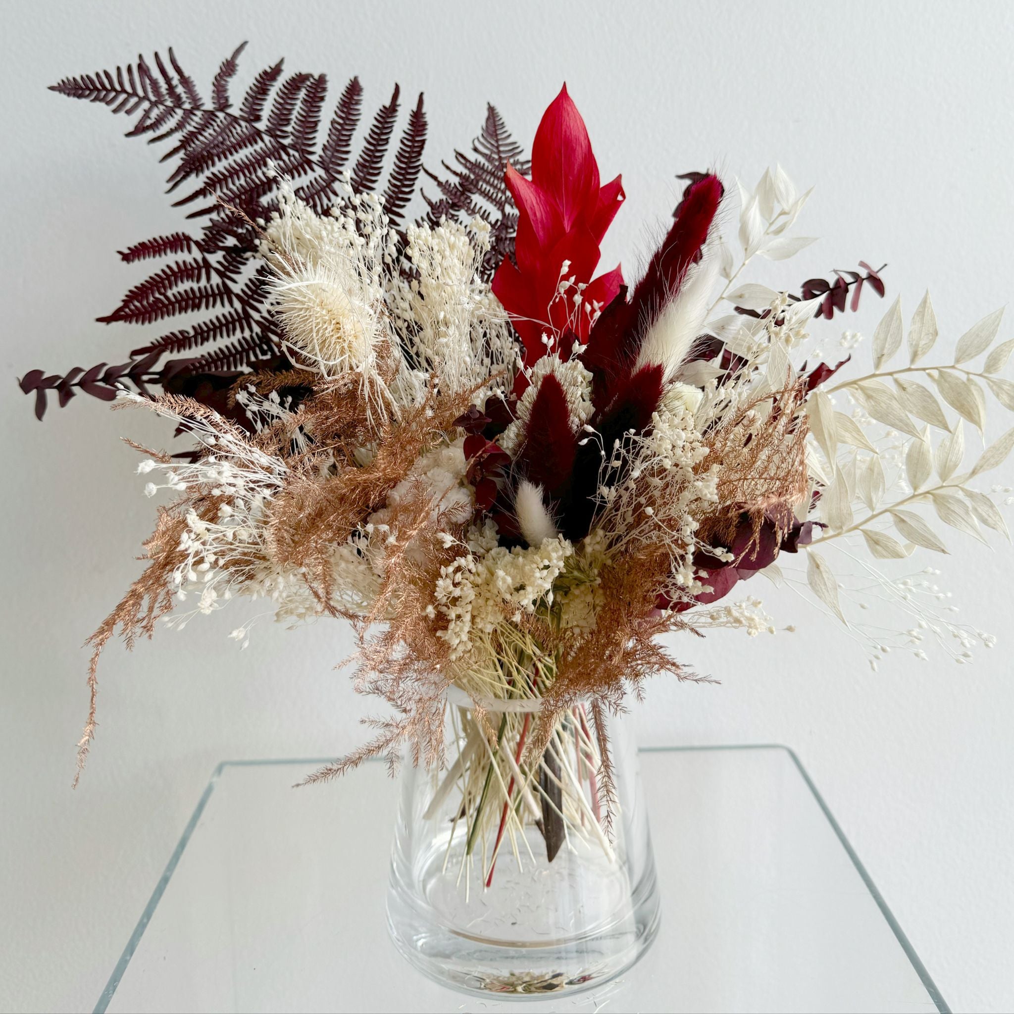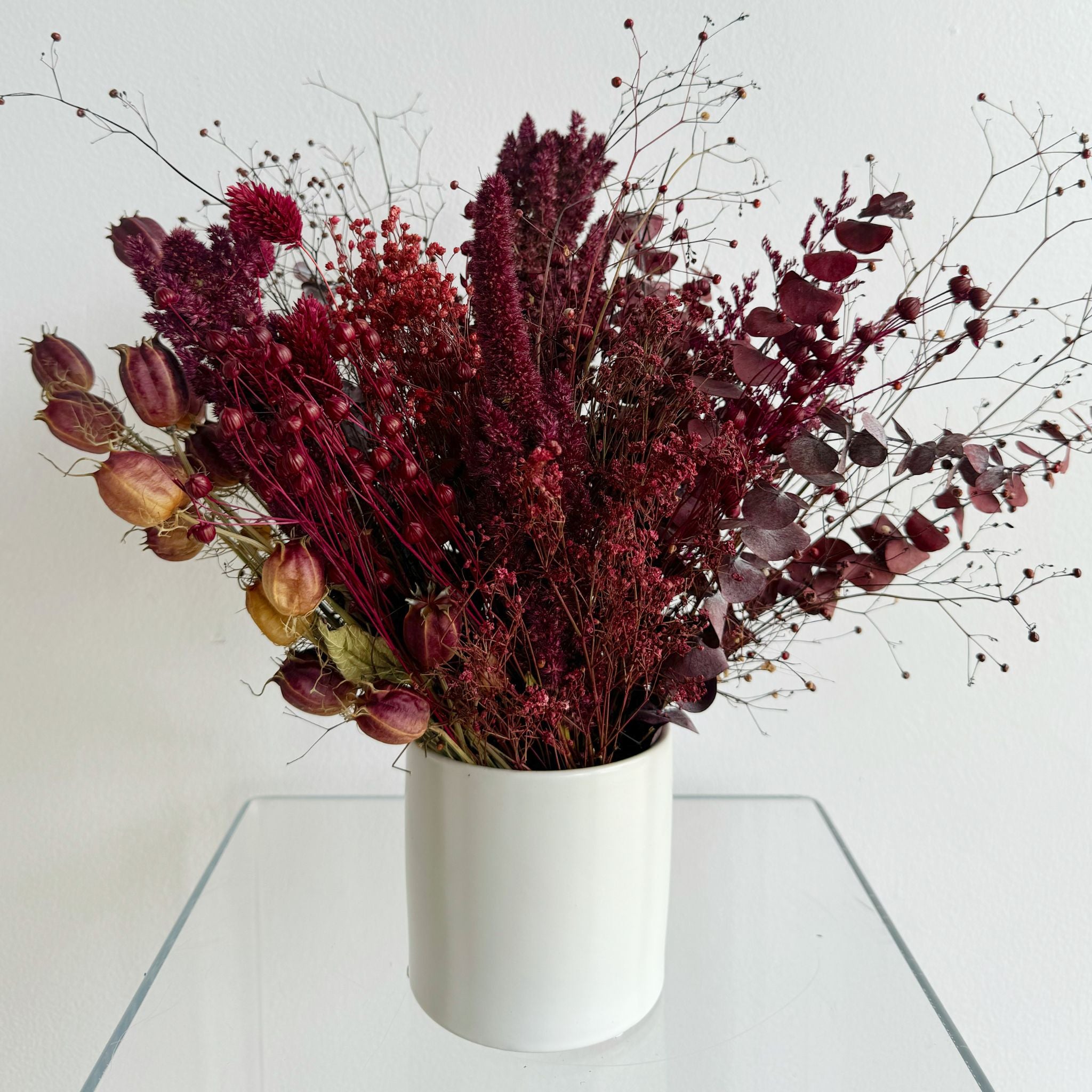 'tis the season for holiday gifts and festive flower decor. and our large accent dried flower arrangement is the perfect focal point decor for your large accent tables this season - think small dining tables, kitchen islands, foyers, consoles, and coffee tables. arrangements are styled 360 degrees so that you see styled flowers from every location in the room. styled in a glass or white ceramic vase. arrangement measures approx. 11 inches wide in circumference and a foot tall. vase measures approx. 4 inches tall and wide.