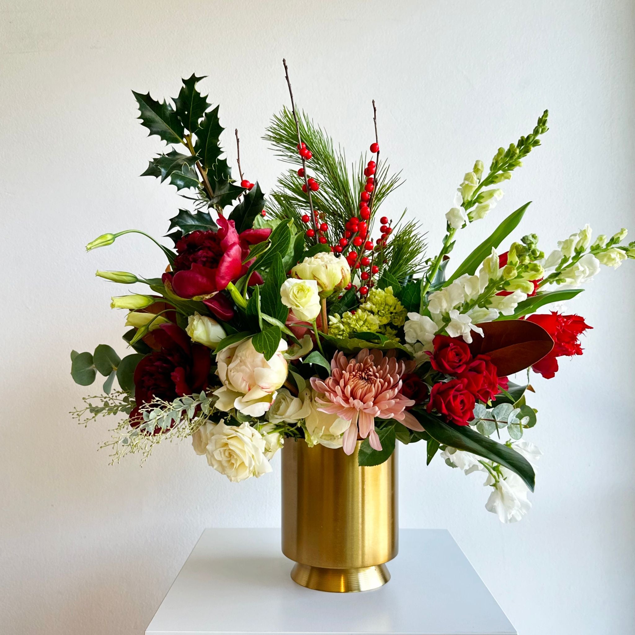 it's the winter statement piece your holiday needs. perfect for entryways or anywhere you want to make into a moment! choose from a seasonal greens arrangement, with our without red ilex berry, or a wow moment of white florals and winter greens, with or without the addition of red pops.