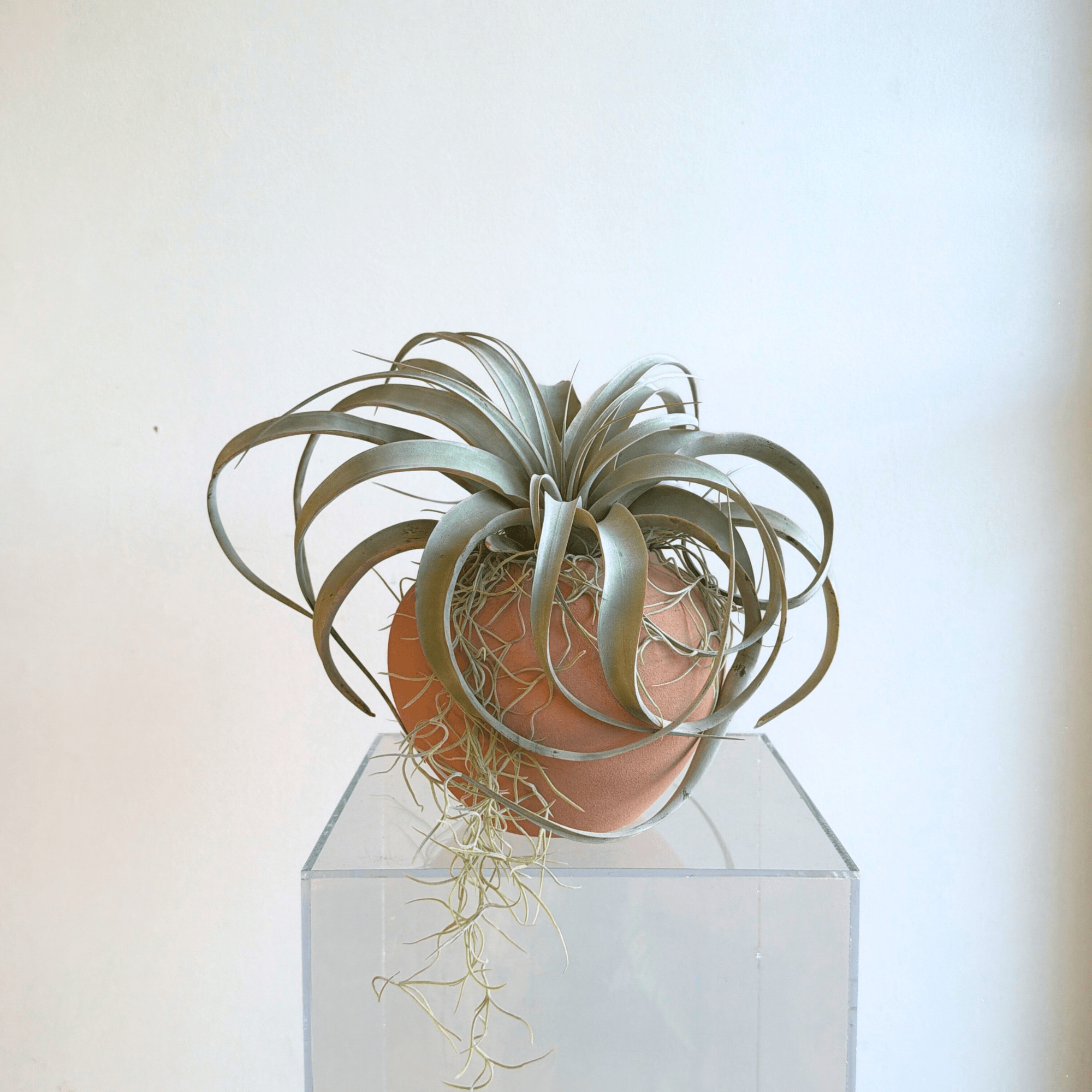 A single air plant—Tillandsia xerographica—rests on hand-placed Spanish moss within a refined clay object.