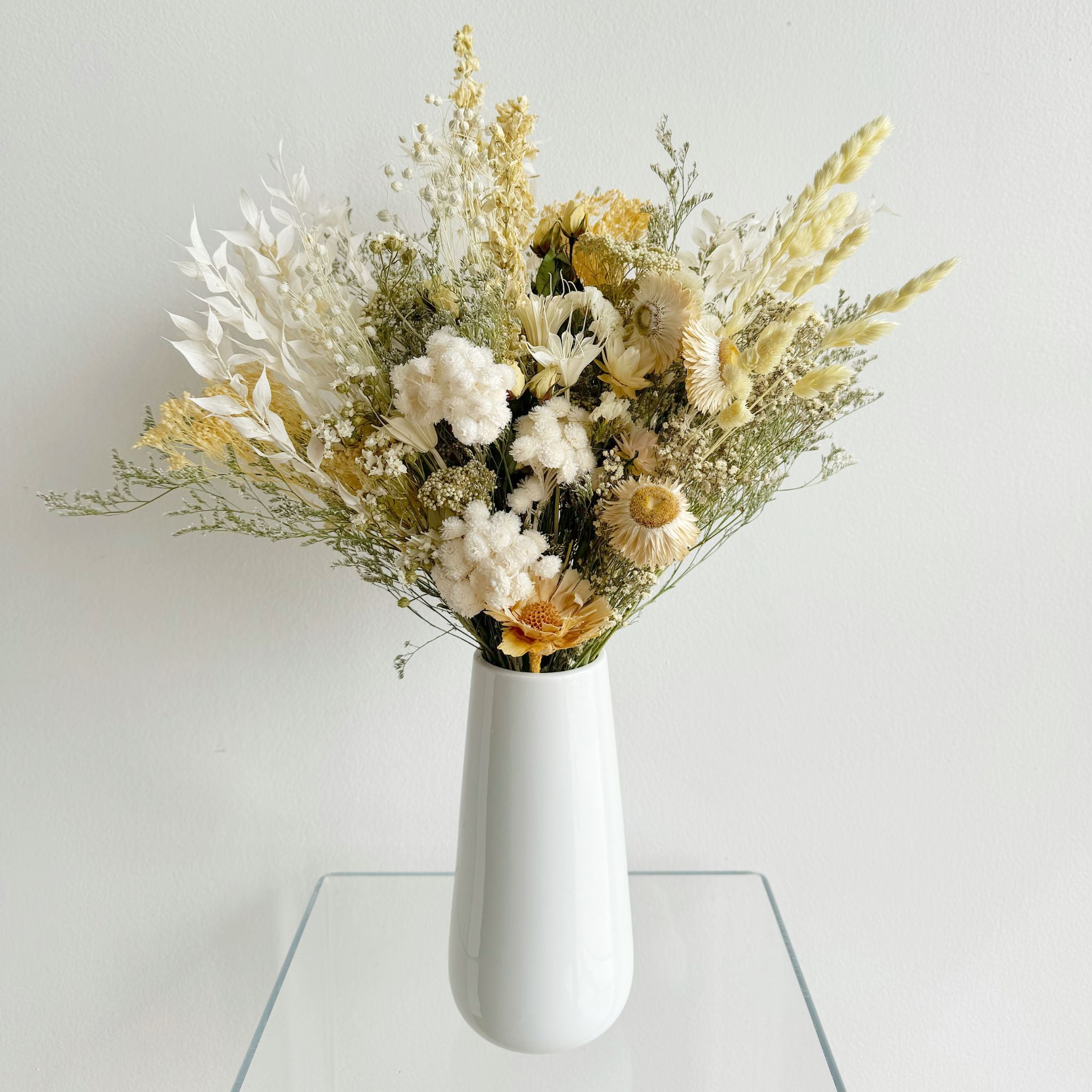 our tall pyramid dried flower arrangement comes styled in 6 different color styles and is the perfect touch for any larger table. it is styled in a 8 inch tall x 2.5 inch wide opening white ceramic vase and measures approx. 17 inches tall x 13 inches wide once styled.