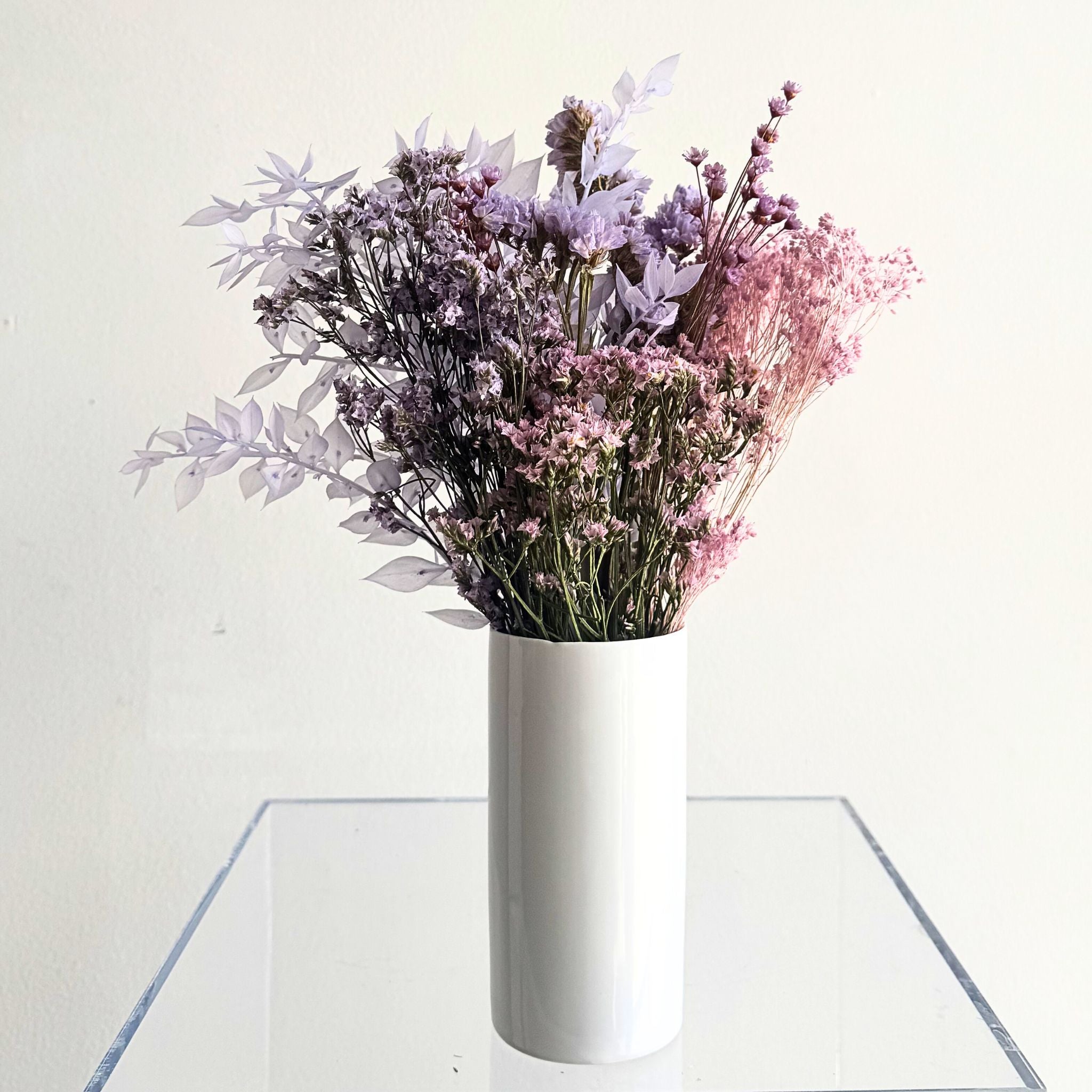 - small dried flower arrangement: styled in our favorite white brooklyn vase, entire arrangement measures: 11 inch height x 5 inch circumference. vase measures approx. 4 inches wide and 5 inches tall.